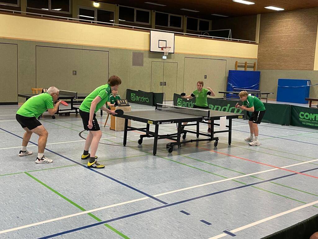 Doch der erfolgreiche Nachmittag von Matz erlebte ein weiteres Highlight im Doppelwettbewerb, wobei seine Reise an der Seite von Maurice Scheib erst im Finale ein Ende fand. Aber der Reihe nach. Insgesamt 8 Doppelpaarungen starteten in die ausschließlich im KO-Modus ausgetragene Doppelkonkurrenz, wobei die Paarungen ausgelost worden sind und somit eine Extraportion Spannung in den Wettbewerb brachten. Unter den 16 Startern spielten 4 Nachwuchsspieler mit, wobei 2 Junioren das Halbfinale klar machten mit Siegen im Viertelfinale. Da die beiden Nachwuchsspieler Matz und Friedi im Halbfinale aufeinander trafen, war ein Nachwuchsspieler im Finale sicher. An den Seiten ihrer erfahrenen Mitspieler Johannes Aumüller bei Friedi Holtgreife sowie Maurice Scheib bei Matz Vogelpohl, lieferten sich die Doppelpaarungen über 4 Sätze ein tolles Spiel, wobei Matz und Maurice sich durchsetzen konnten. In der anderen Turnierhälfte setzten sich in 2 epischen 5 Satzspielen Dirk Werries und Niklas Hagedorn durch, wobei u.a. ein 2:0 Satzrückstand im Halbfinale gegen Thomas Böckmann und Christian Riedemann gedreht werden konnte. Im Finale ging es über 4 Sätze, wobei sich am Ende Dirk Werries und Niklas Hagedorn durchsetzen konnten. Für Dirk war es sein erster Vereinsmeistertitel der Karriere. Seinem Doppelpartner Niklas gelang die Titelverteidigung seines letztjährigen Titels.